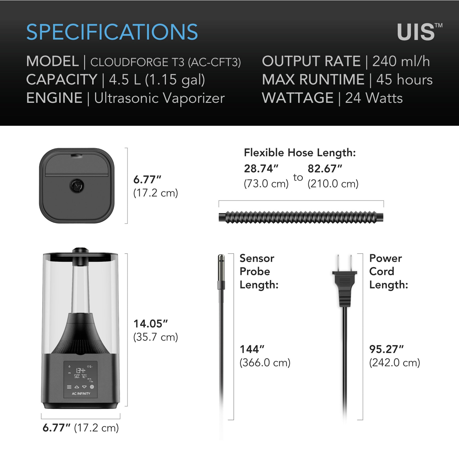 A next-gen 4.5L humidifier designed with smart controls and targeted vapor delivery to obtain ideal humidity levels for successful plant growth. Its body is specially sealed for enhanced water resistance, ensuring no water tank leakage to extend and preserve its long operational lifespan. The controller features onboard humidity and VPD triggering, which utilizes a corded sensor probe for accurate readings, and timer programming. Once activated, the innovative EC ultrasonic vaporizer digitally pulses water to distribute moisture throughout your grow space. This degree of control, together with smart programming, will allow you to fine-tune your climate to facilitate healthy nutrient uptake. This product is a part of the UI platform of grow devices and smart controllers, designed to unite with the AC Infinity app over WiFi to achieve your ideal environment.