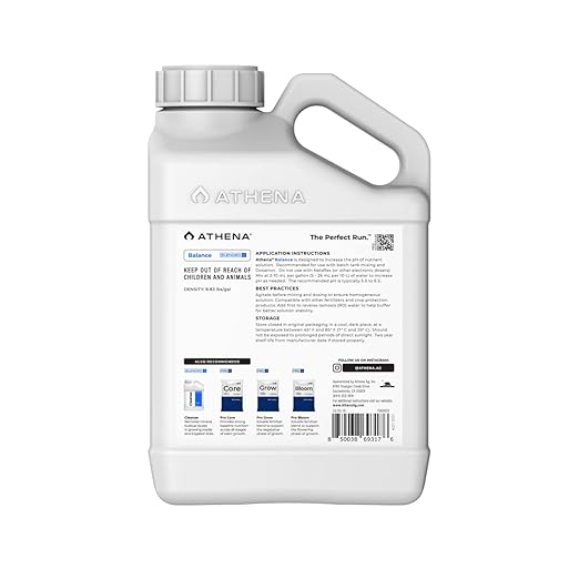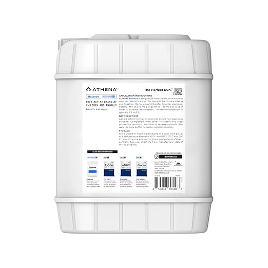 Commercial growers find better results, particularly with reverse osmosis (RO) water, when buffering first with Athena Balance. Pure RO water has unstable chemical structure that can trap other nutrients when added without a buffer. Athena Balance adds just enough to the water to create a more homogenous fertilizer solution and reduce the need to pH adjust after mixing.