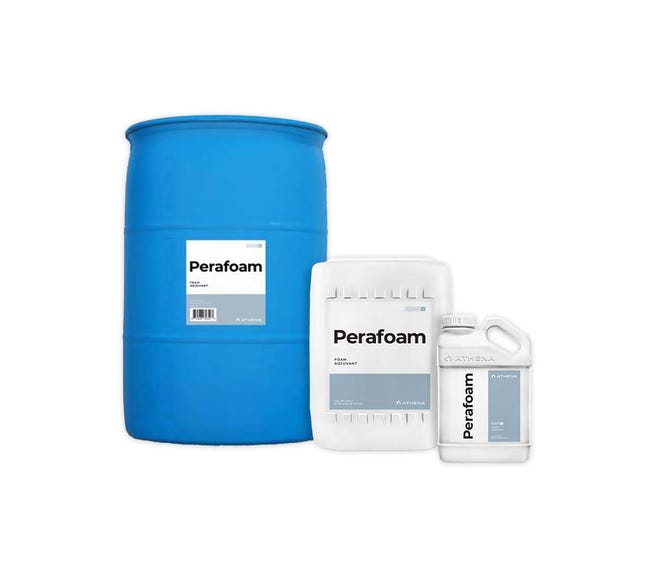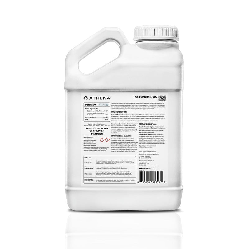 Athena Perafoam is a high-foaming concentrate designed to work with Athena Reset for sanitizing and disinfecting hard surfaces. It is effective at temperatures as low as 35°F (2°C) and is compatible with hard water and oxidizers. The product produces long-lasting foam, allowing for extended contact on vertical surfaces and equipment, enhancing cleaning efficacy. No rinse is required when used at the recommended dose.