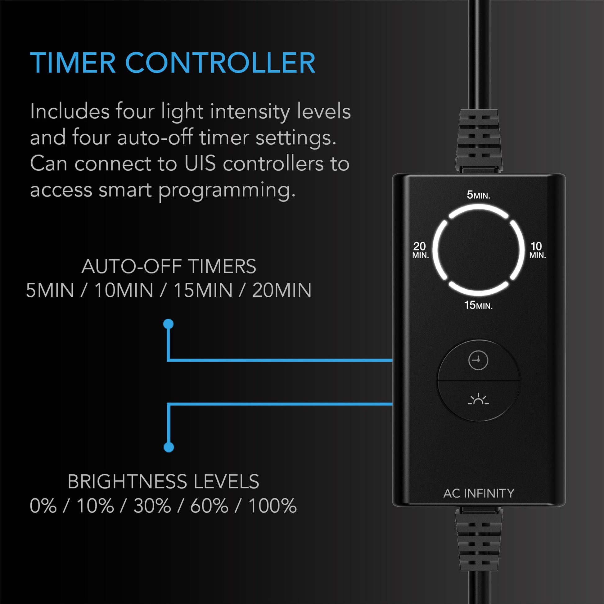 - Digital controller features four brightness levels, auto-off timer programming, and UIS compatibility.