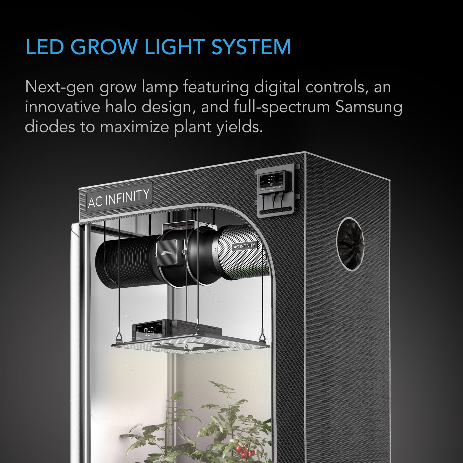 An indoor LED grow lamp with an innovative halo design crafted to maximize plant yields by providing uniform coverage and deeper light penetration. This LED grow system uses the latest Samsung LM301H diodes to efficiently produce full-spectrum lighting fit for use during the germination, vegetative, and flowering stages. The grow tent light is built with a raised LED driver, set on top of an aluminum frame with a thermal compound for no-noise heat dissipation. This, along with the included digital controller, also enables pairing with additional LED grow lights when using expansion dongles (sold separately). It is primarily set in grow tents with interior reflective Mylar lining, and used to cultivate a variety of plants, fruits, and vegetables. Each unit is plug-and-play, and includes a set of rope hanging hardware to be ready for use out of the box. This product is a part of the UIS™ platform of grow devices and smart controllers, designed to integrate with each other to achieve your ideal environment.